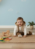 - شلوار کتان با کمر کشی: شلوار این مجموعه از جنس کتان باکیفیت است که علاوه بر ظاهر شیک، بسیار بادوام است. کمر کشی آن باعث میشود شلوار به راحتی پوشیده شده و فشاری به کودک وارد نکند، در نتیجه آزادی حرکت کامل را برای او فراهم میآورد.