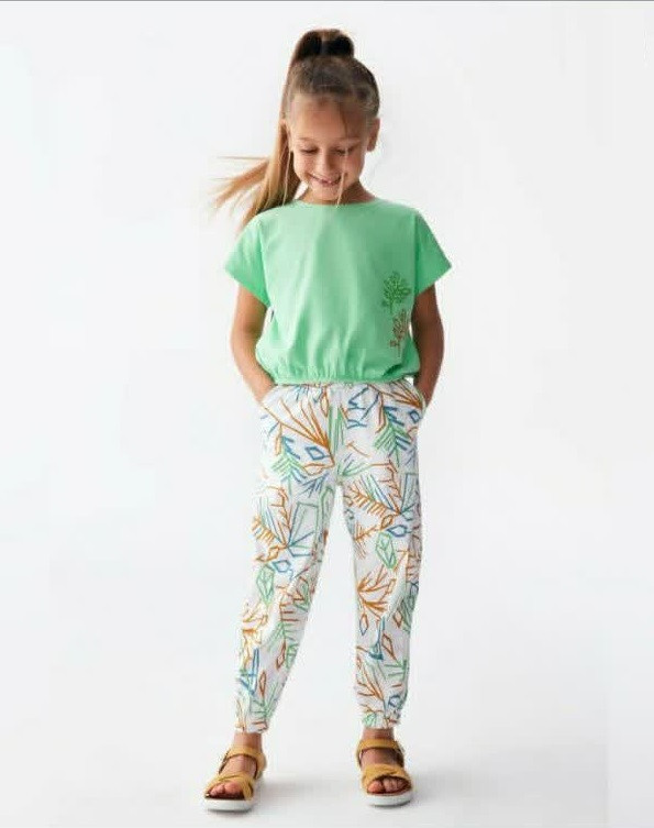 - طراحی جذاب و هماهنگ: ست شامل یک تیشرت ساده به رنگ سبز پاستلی و یک شلوار جاگر با طرح برگهای استوایی است که ترکیبی شاد و تابستانی را ایجاد کرده است.
