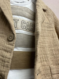 - کت: کت تک با طراحی کلاسیک و رنگ خاکی، دارای بافت پارچهای خاص و جذابی است که ظاهری شیک به کودک میبخشد.