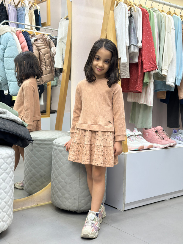 این پیراهن دخترانه با طراحی خاص و رنگ ملایم، انتخابی ایدهآل برای فصلهای پاییز و زمستان است. پارچهی این محصول تمام نخ با کیفیت بوده و بافت نرم و لطیفی دارد که باعث راحتی و تنفس پوست میشود. بخش بالایی پیراهن دارای بافتی شبیه پلیور است و قسمت دامن آن با طرح گلهای ریز تزئین شده که جلوهای دخترانه و شیک به لباس میدهد. این محصول کار ترک (Made in Turkey) بوده و از کیفیت دوخت و پارچه بسیار بالایی برخوردار است.