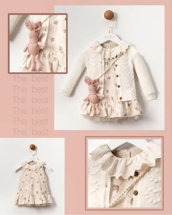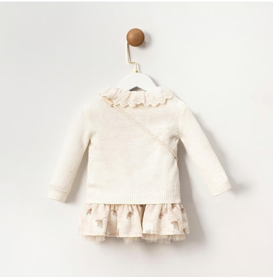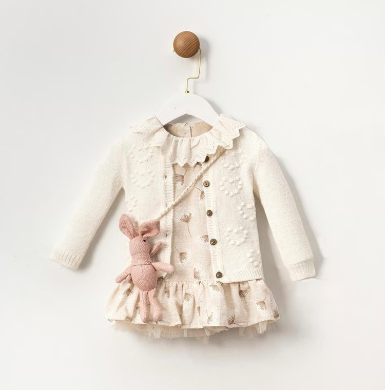 ست 3 تکه مجلسی دخترانه شامل سارافون، ژاکت بافت و کیف عروسکی