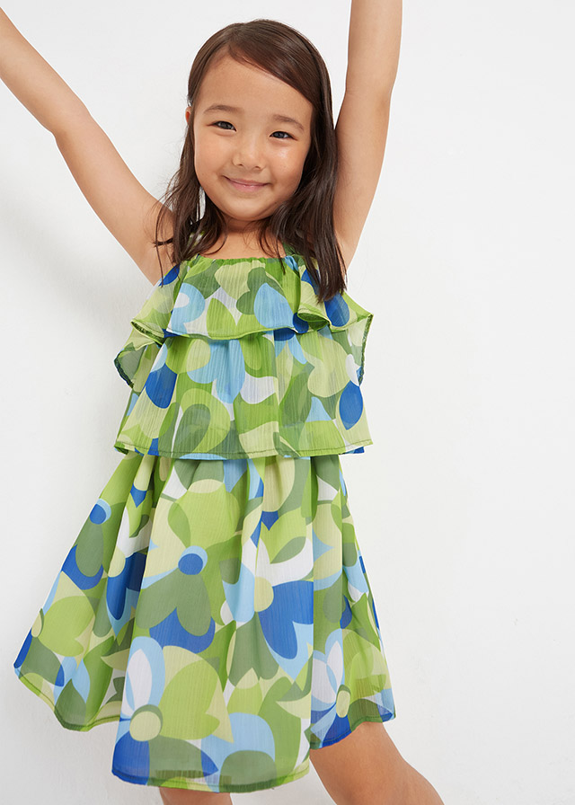 این پیراهن دخترانه خوشرنگ با طراحی کلاسیک از برند مایورال(Mayoral) اسپانیا است . این پیراهن مناسب جشنها، تولد و استفاده روزمره میباشد. این محصول اورجینال است .پارچه فوق العاده خوشرنگ و درخشانی دارد و تنخور واستایل زیبای آن در عکس مشخص می باشد. اندازه های سایز در ادامه مشخص شده است.