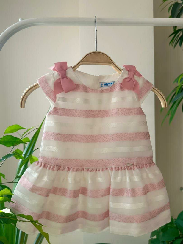 این پیراهن مجلسی دخترانه از برند اورجینال مایورال با طراحی ظریف و رنگ سفید صورتی کلاسیک، انتخابی ایدهآل برای مراسم، جشنها و مهمانیهای رسمی کودک است.