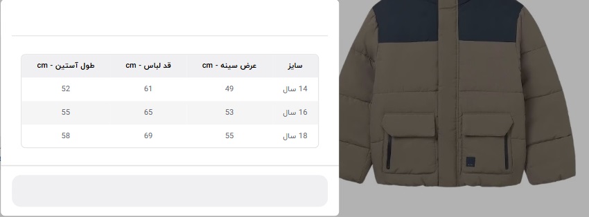 جدول سایز در البوم تصویر محصول